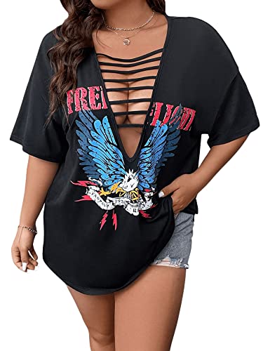 SOLY HUX Women's Plus Size Letter Graphic Tees Cut Out Deep V Neck Half Sleeve T Shirts Tops 6