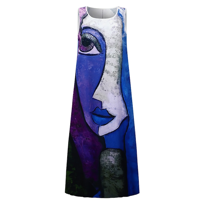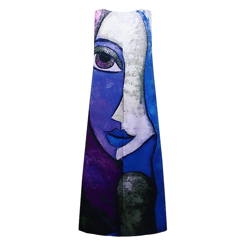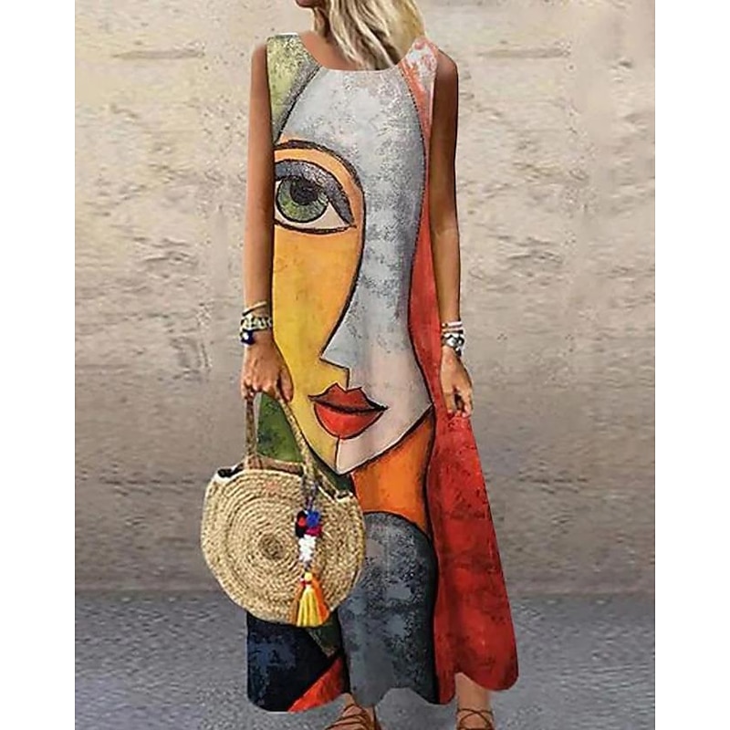 Highlights [Fabric] : This women's sleeveless maxi dress is crafted from lightweight and breathable polyester, ensuring comfort during warm spring and summer months. The micro-elastic fabric allows for easy movement and a relaxed fit. [Design] : Showcasing a bold and artistic abstract face design, this dress draws inspiration from modern art, featuring a vibrant color block pattern with shades of orange, yellow, and green. Its eye-catching aesthetic is perfect for making a style statement. The crew neck and shift style provide a modern look, while the maxi length adds an elegant touch. [Design Highlights] : The dress boasts a classic crew neckline and features an abstract, colorful print that stands out. The sleeveless design, combined with a relaxed shift silhouette, offers both style and comfort, perfect for warm weather outings. [Occasions] : Ideal for vacations, holidays, daily wear, or casual outings, this dress is a versatile addition to any wardrobe. Its vibrant print and relaxed fit make it perfect for beachwear or stylish summer gatherings. [Size Range] : Available in sizes S, M, L, XL, XXL, and 3XL, accommodating a wide range of body types and preferences for a comfortable fit.
