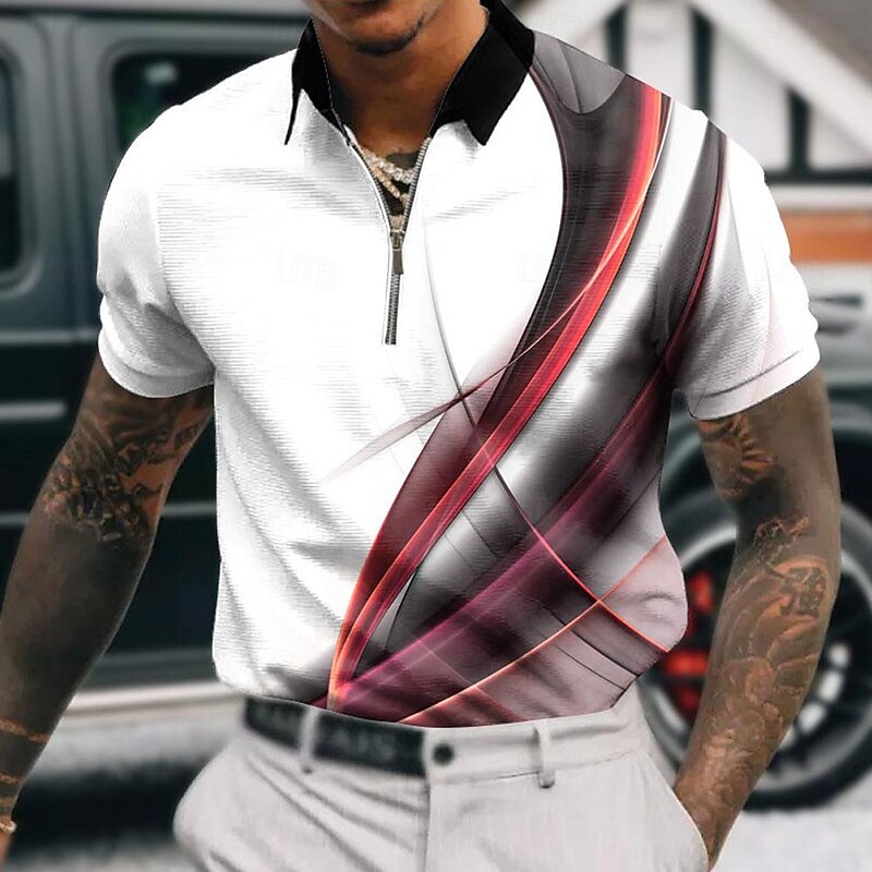 HOT ! Men's Geometric Zip Polo Shirts Golf Shirt Short Sleeve Polo Shirts Collared Shirts Business Casual Vacation Wear Formal Wear Festival Wear 3D Print Quarter Zip Polo Yellow Pink Red