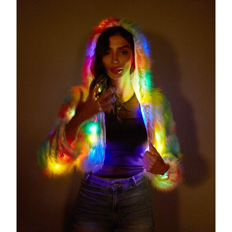 Highlights [Fabric] : Crafted from a soft faux fur material, this jacket offers a plush and cozy texture, making it ideal for colder weather and ensuring comfort throughout wear. The faux fur's vibrant colors create an eye-catching display, perfect for standing out in any crowd. [Fit] : Designed with a relaxed cut, this jacket provides a comfortable fit that allows for easy movement and layering. It's perfect for those seeking both style and comfort in their outerwear choices. [Design Highlights] : The jacket features integrated LED lights embedded throughout the fabric, creating a luminous effect that captures attention and adds a playful twist to any outfit. The design also includes a hood, which enhances both style and warmth, making it versatile for various events. [Occasions] : This light-up faux fur jacket is perfect for parties, festivals, masquerade events, and other evening gatherings. Whether you're attending a rave or celebrating a birthday, this jacket is a novelty piece that adds fun and flair to any occasion. [Size Range] : Available in sizes S, M, L, XL, 2XL, and 3XL, this jacket caters to a wide range of body types, providing an inclusive size spectrum for all adults looking to make a bold statement.