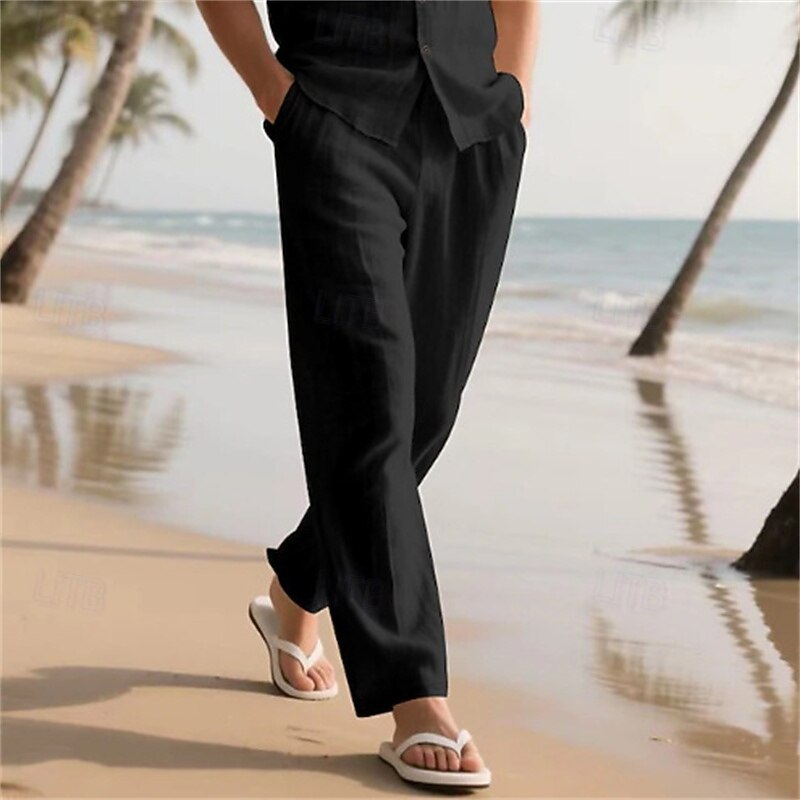HOT ! Men's Linen Pants Trousers Summer Pants Baggy Pants Beach Pants Elastic Waist Drawstring Straight Leg Plain Comfort Breathable Full Length Outdoor Casual Daily Vacation Classic Style Black White