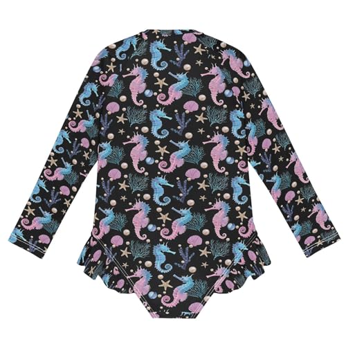 ALAZA Pearl Shell Seahorse Starfish Black Girls One Piece Swimsuit Long Sleeve Rash Guard Swimsuits UV 50+ Swimwear Zipper 1