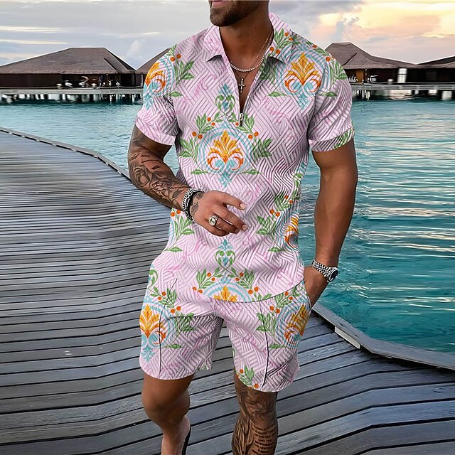 More information about Men's Geometry Polo Shirts Golf Shirt Polo Set Short Sleeve Shirt Turndown Casual Daily Yellow Pink Light Grey Gray Zipper 2 Piece Clothing Apparel Fashion Designer Casual Breathable