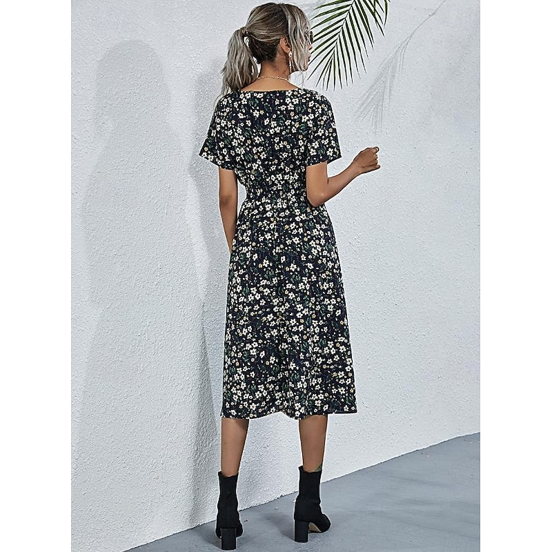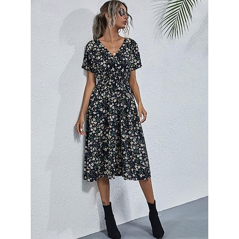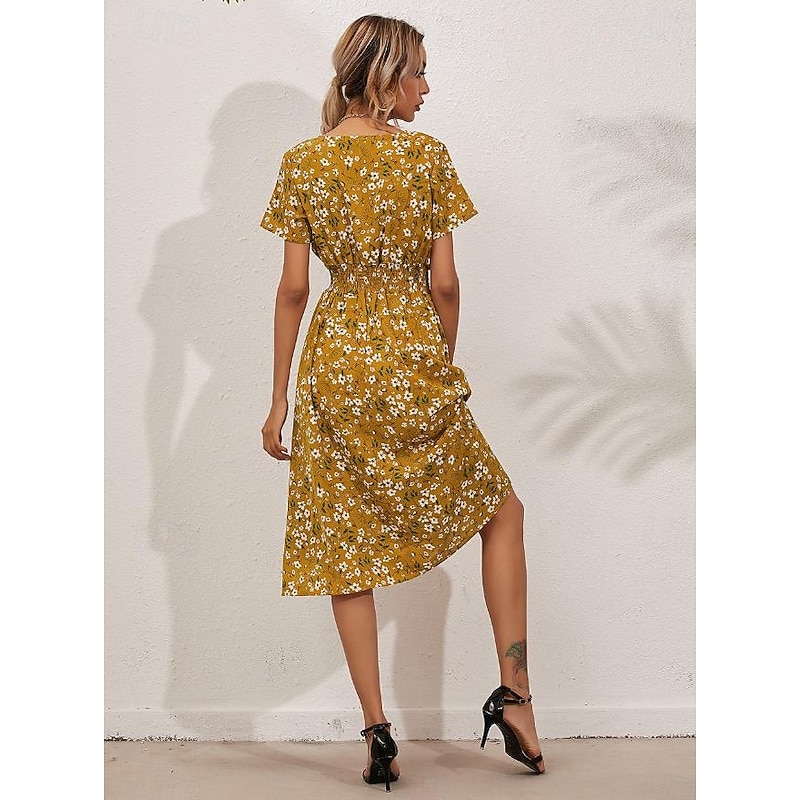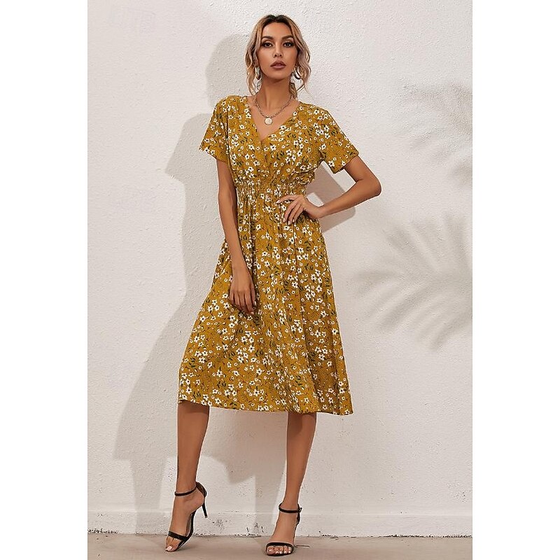 Women's Midi Dress Casual Dress Swing Dress A Line Dress Stylish Casual Vacation Daily Regular Fit Floral Short Sleeve V Neck Black White Yellow Pink Summer 22
