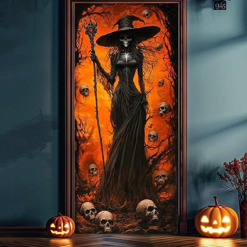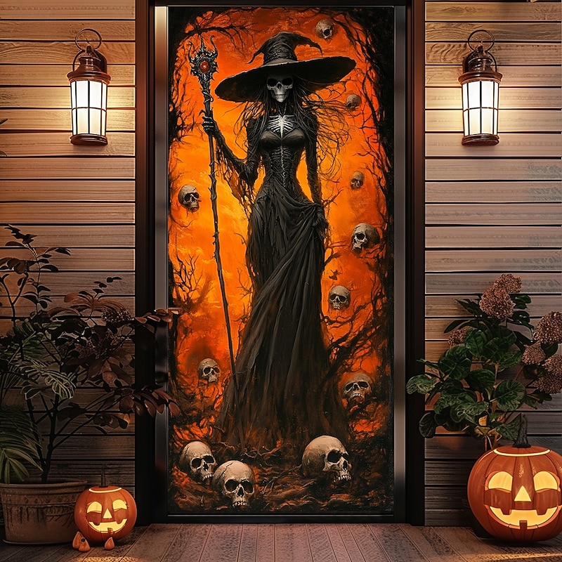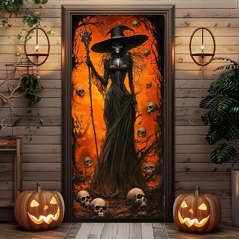 HOT ! Halloween Door Decorations Halloween Door Covers Skeleton Witch Door Tapestry Door Curtain Decoration Backdrop Door Banner for Front Door Farmhouse Holiday Party Indoor Outdoor Decor Supplies