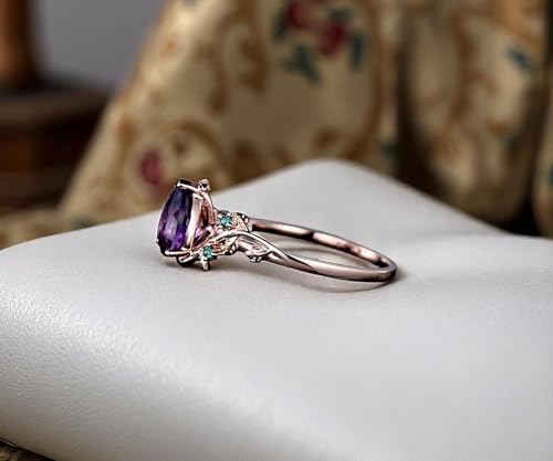 Amethyst ring vintage pear Amethyst engagement ring 14k rose gold twig leaf emerald bridal wedding ring women February birthstone ring gift 2