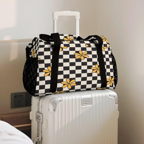 HOT ! Daisy Floral Black White Checkered Personal Item Bag Travel Duffel Bag Sports Tote Gym Bag Luggage Duffle for Women Men