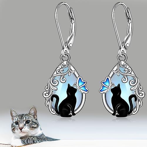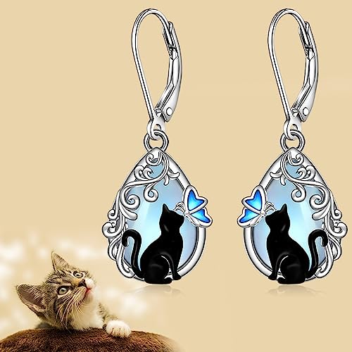 HOT ! Cat Earrings Moonstone Black Cat Earrings for Women Sterling Silver Filigree Butterfly Dangle Drop Jewelry Leverback Halloween Christmas Gifts