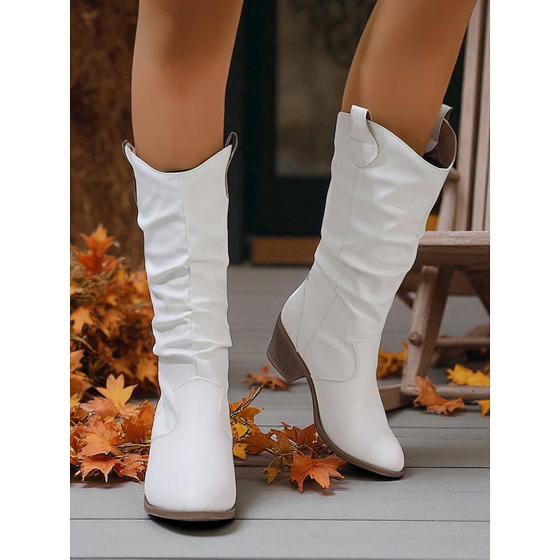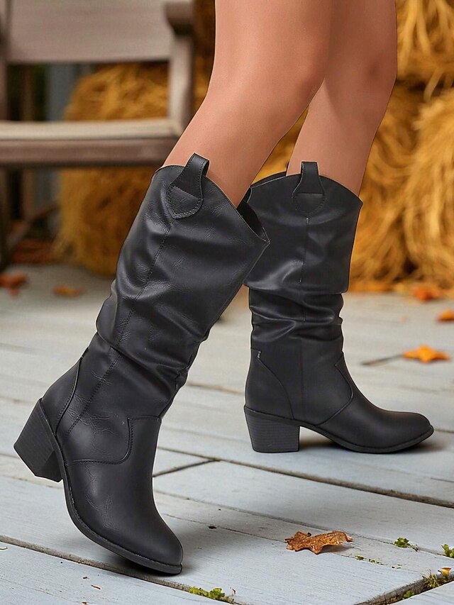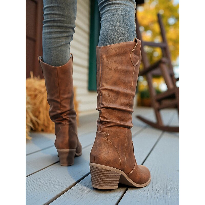 HOT ! Women's Brown Slouchy Mid-Calf Boots – Chunky Heel Western-Style Boots for Fall Fashion, Outdoor Events and Casual Days
