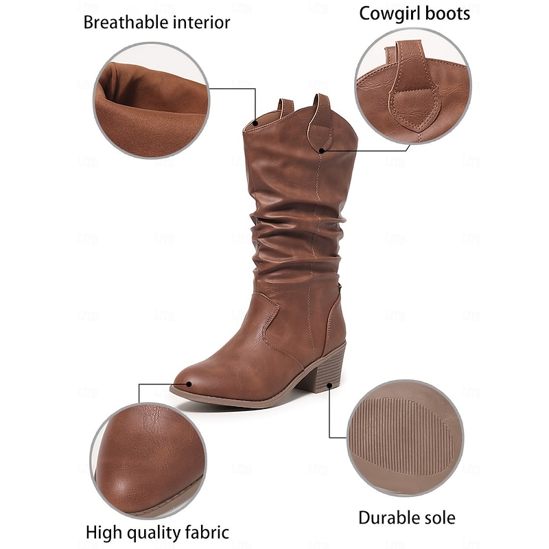 Women's Brown Slouchy Mid-Calf Boots – Chunky Heel Western-Style Boots for Fall Fashion, Outdoor Events and Casual Days 4