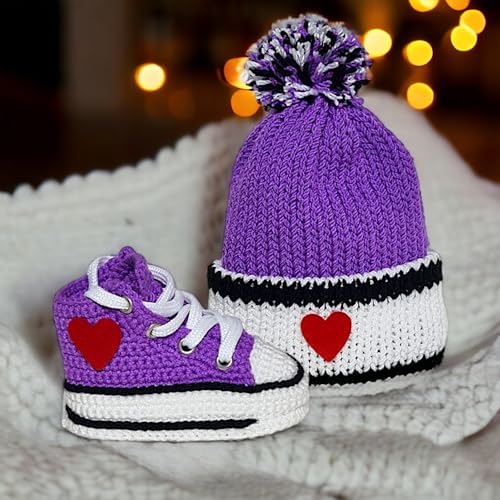 HOT ! Handmade Gender Neutral Baby Crochet Purple Sneakers & Beanie Set - Soft Sole, Customizable, Perfect for Newborn Boys & Girls