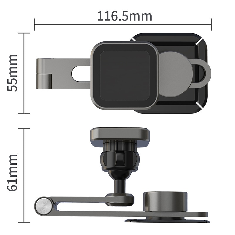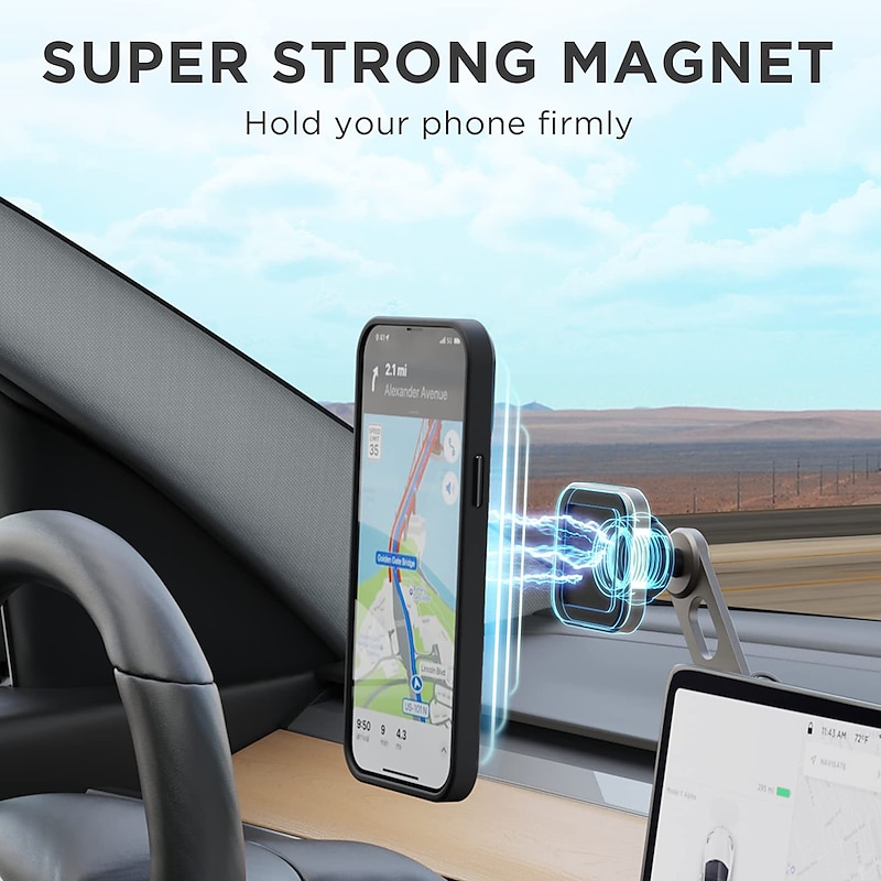Highlights - The Invisible Foldable Phone Mount features a 360° rotational base and a unique adjustable hinge, allowing for customizable distance and angle between dash and phone. - Its retractable design preserves the minimalist aesthetic of the Tesla Model 3/ Model Y. - The Strong Magnets securely hold the heaviest of smartphones in place, even on bumpy roads. - The adjustable and extendable telescopic arm, alongside the innovative ball joint construction, allows for 360° viewing angle adjustment with easy one hand operation. - The Universal Compatibility Magnetic Car Holder works with all smartphone models. (Note: metal plate attachment required for back of phone or phone case)