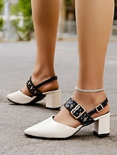 More information about Women's Beige Pointed-Toe Block Heel Sandals with Studded Buckle Straps – Stylish and Comfortable for Work, Parties and Casual Wear