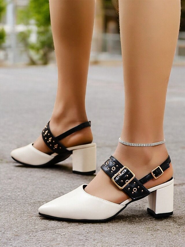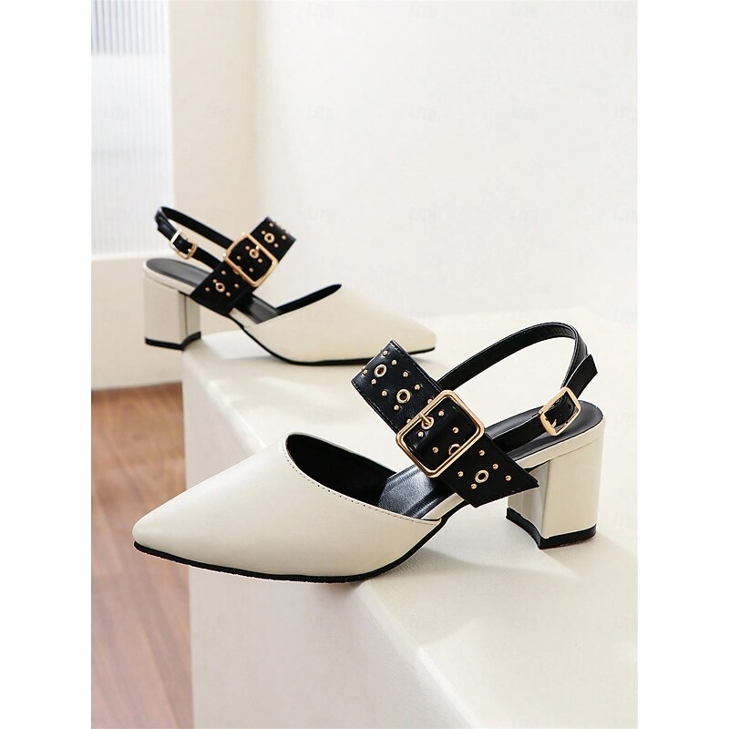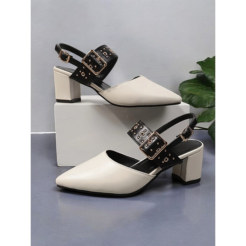 HOT ! Women's Beige Pointed-Toe Block Heel Sandals with Studded Buckle Straps – Stylish and Comfortable for Work, Parties and Casual Wear