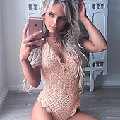 Highlights [Fabric] : Crafted from high-quality POLY fabric, this bodysuit is both delicate and durable, perfect for all-season comfort. The intricately woven floral lace offers a sophisticated and feminine touch, while the micro-elastic quality ensures a flexible fit. [Fit] : Designed to hug your curves, this sexy bodysuit offers a tailored fit that enhances your silhouette. The adjustable spaghetti straps allow for a personalized fit, ensuring both comfort and elegance throughout wear. [Design Highlights] : Featuring a seductive deep V-neckline with scalloped edges, this piece combines elegance and allure. The sheer fishnet detailing across the midsection adds a flirty element, while the backless design further heightens its captivating appeal. Available in classic solid colors: white, black, red, and pink, it complements various styles and preferences. [Occasions] : Ideal for intimate evenings or as a sensual piece of nightwear, this bodysuit is the perfect blend of seduction and sophistication. Whether you're planning a romantic night in or looking to add an element of allure to your wardrobe, this lingerie set is a must-have. [Size] : Available in a range of sizes from S to XL, this bodysuit caters to diverse body types, providing a flattering fit for adults seeking both comfort and style.