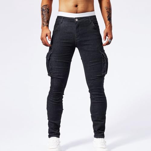 HOT ! Men's Slim Fit Jeans with Multi Pockets Casual Cargo Denim Pants Streetwear