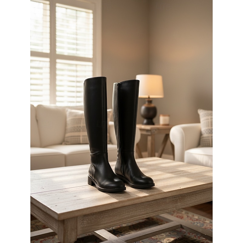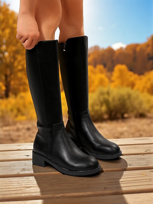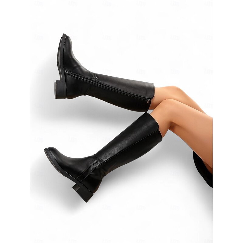 HOT ! Women's Faux Leather Knee-High Boots with Side Zipper and Low Block Heels, Sleek Urban Fashion Footwear