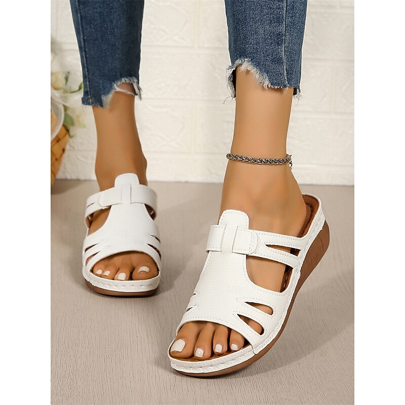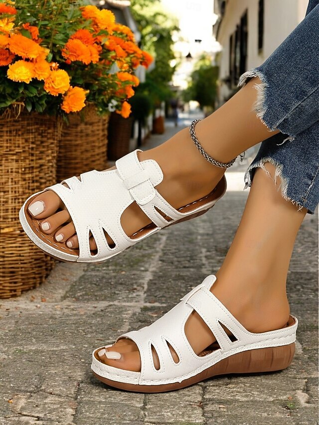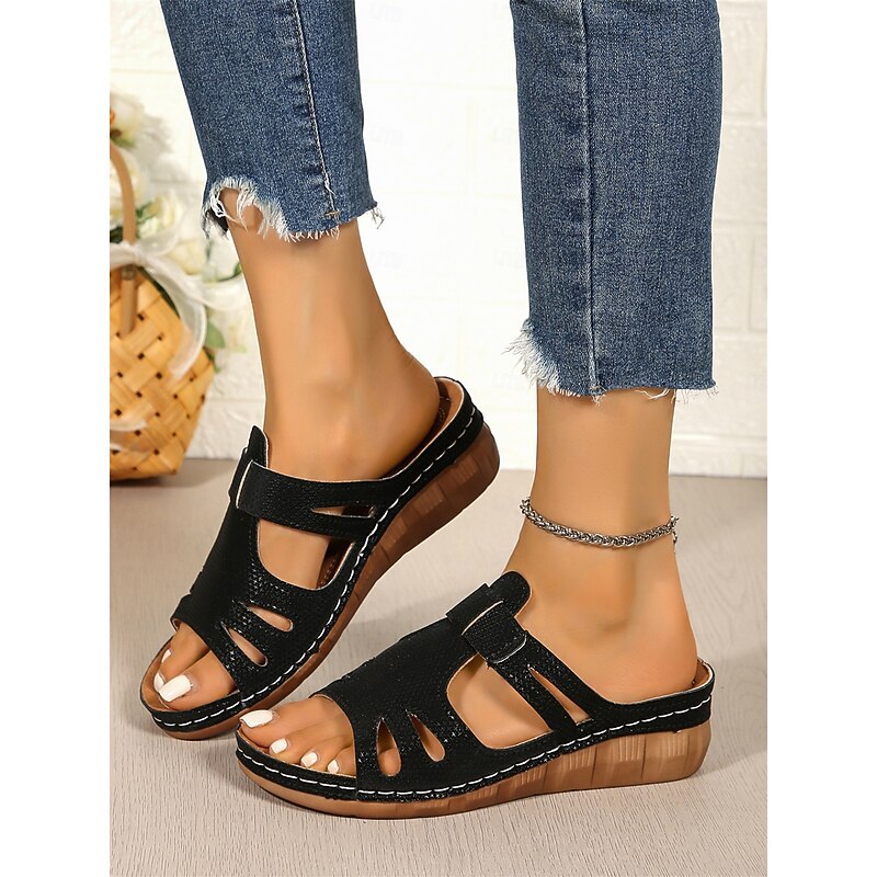 Highlights - Made with high-quality faux leather - Features a stylish round toe design - Offers a trendy open toe option - Durable rubber outsole for long-lasting wear - Stay ahead of the fashion curve with 2024's trend of wedge sandals