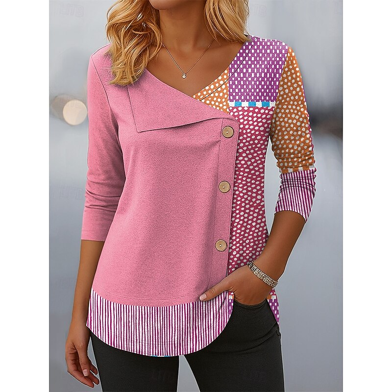 More information about Women's Blouse Tunic V Neck Long Sleeve Buttons Graphic Geometric Plaid Vintage Stylish Casual Crew Neck Asymmetrical Tops Daily Patchwork Print Light Green Pink Red Purple Orange Spring Fall Winter