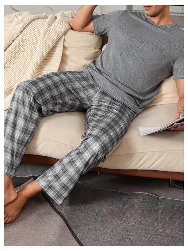 OYOANGLE Men's 2 Piece Pajama Set Short Sleeve T Shirt and Plaid Pants Pjs Summer Sleepwear 4
