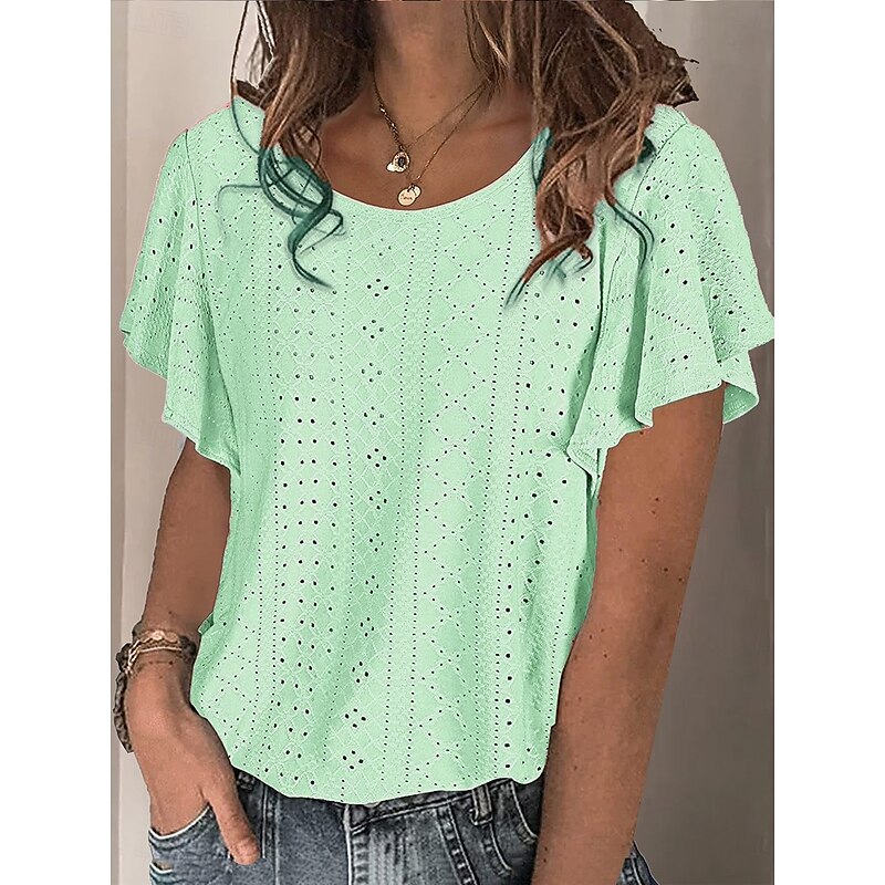 More information about Women's White Elegant Lace Tops Eyelet Blouse Stylish Casual Solid Color Butterfly Sleeve Short Sleeve Regular Tops Crew Neck Daily Romantic Petite Tops Summer Holiday Wear White Pink Purple Green