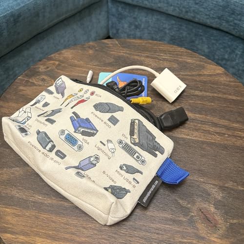 • The double-sided Cables & Ports Zipper Bag is proof we all seek connection (in person or virtually). This 100% cotton bag features 28 hand-drawn illustrations of well-known cables and ports from across the years, from HDMI to RCA.