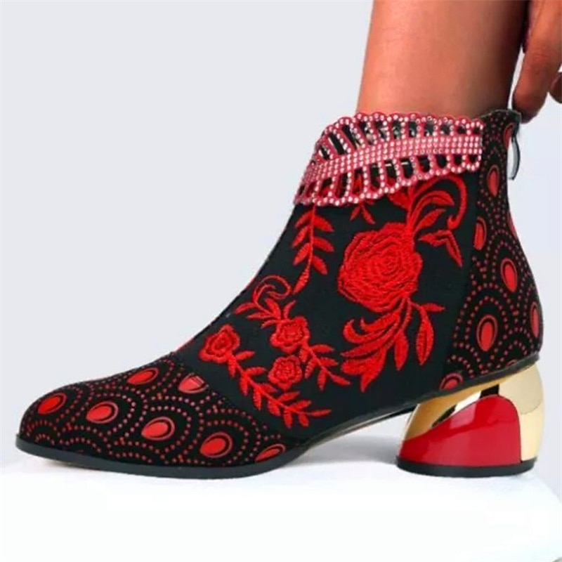 Women's Rhinestone Embellished Floral Jacquard Ankle Boots - Elegant Blue Velvet Heels for Evening Events 10