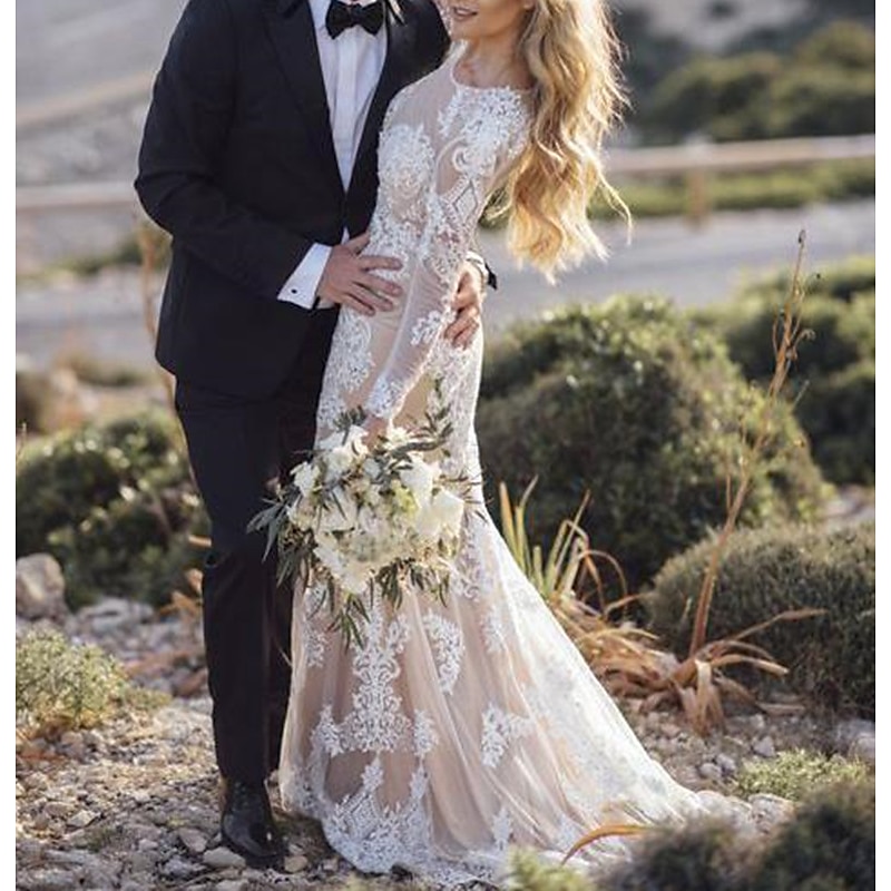More information about Beach Wedding Beach Simple Wedding Dress in Color Boho Wedding Dresses Mermaid Scoop Neck Long Sleeve Court Train Lace Bridal Gowns With Appliques