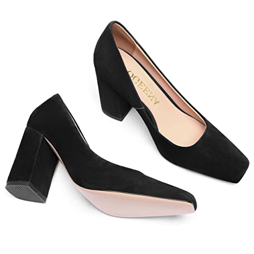 FOGEENA Womens Square Toe Suede Leather Dress Slip On Wedding Block High Heel Pumps Shoes 3.34 Inch 3