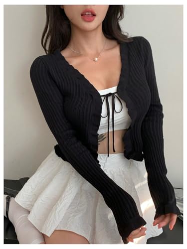 HOT ! GORGLITTER Women's Tie Front Cropped Cardigans Ruffle Long Sleeve V Neck Cute Coquette Sweater