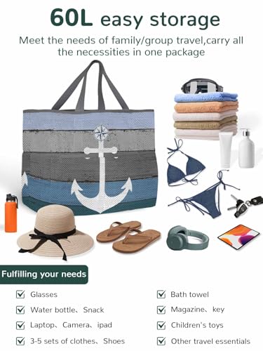 Mesh Beach Bag Oversized Tote Bags for Women Nautical Anchor Ocean Theme Large Travel Pool Bags with 8 Pockets 5
