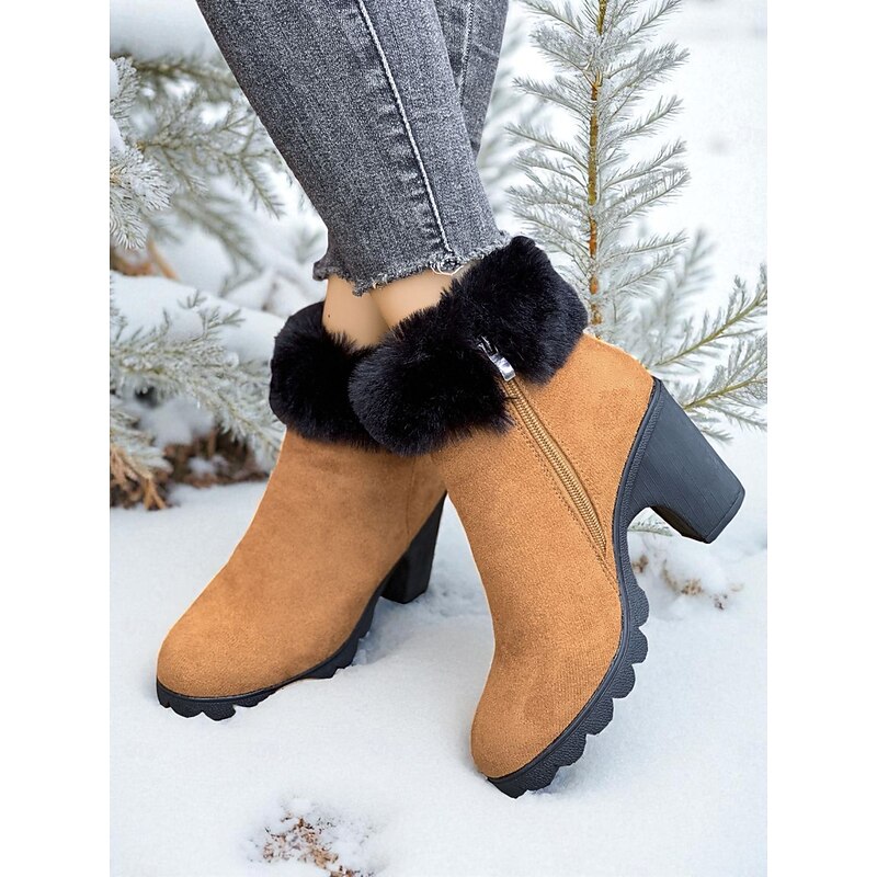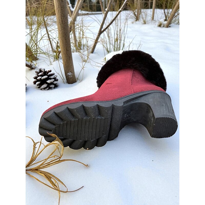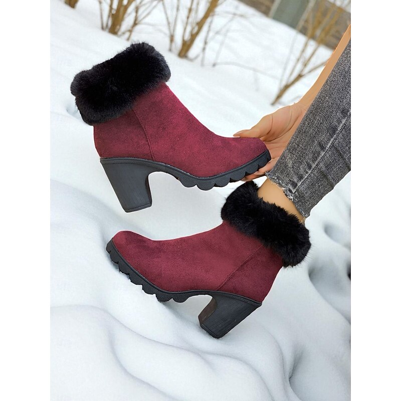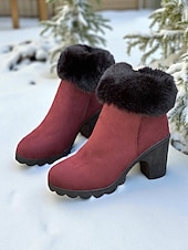 More information about Women's Burgundy Faux Suede Ankle Boots with Faux Fur Lining and Chunky Mid Heels, Warm Fashion Winter Booties for Outdoor Wear & Holiday Outfits