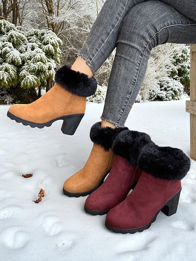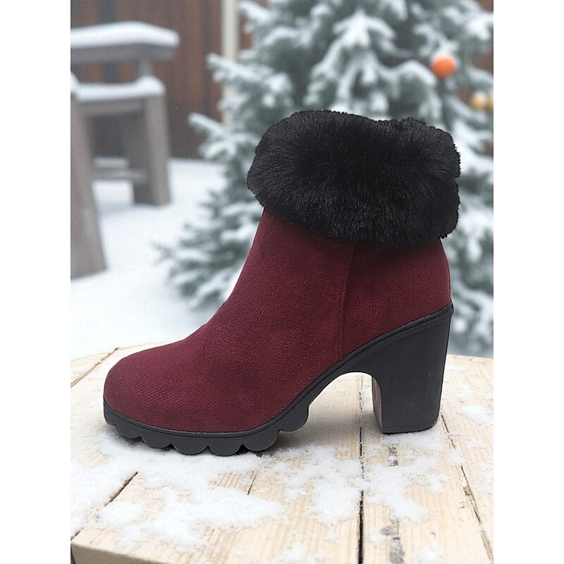 HOT ! Women's Burgundy Faux Suede Ankle Boots with Faux Fur Lining and Chunky Mid Heels, Warm Fashion Winter Booties for Outdoor Wear & Holiday Outfits
