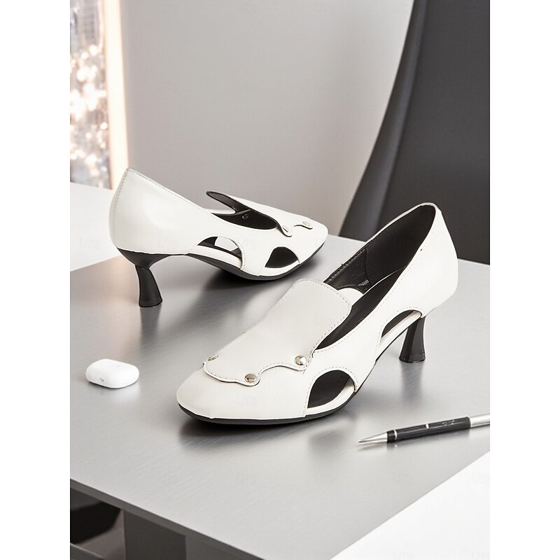 HOT ! Women's Square Toe Heels – Artistic Cutout Faux Leather Pumps with Kitten Heel for Creative Workspaces