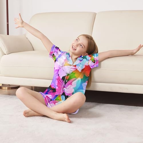 HOT ! senya Colorful Glowing Radial Butterflies Satin Summer Pajama Sets Silk Short Sleeve Button Down Sleepwear