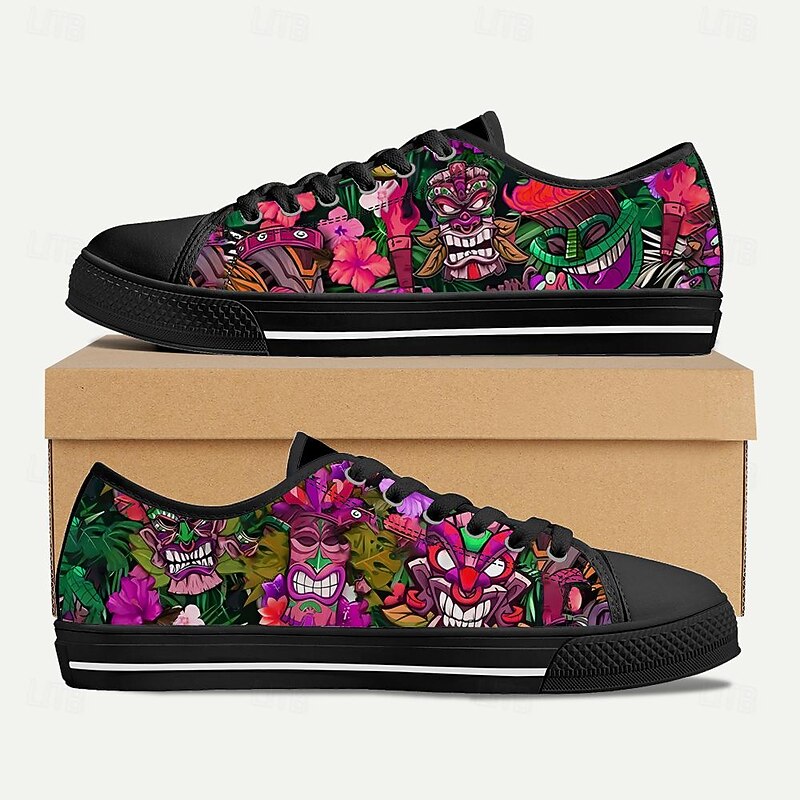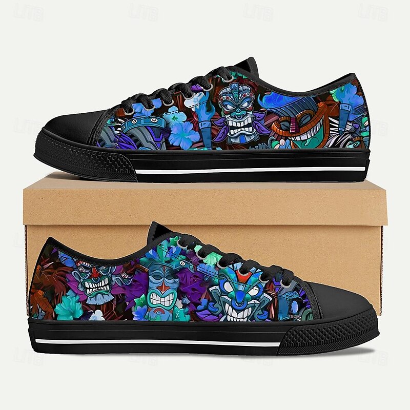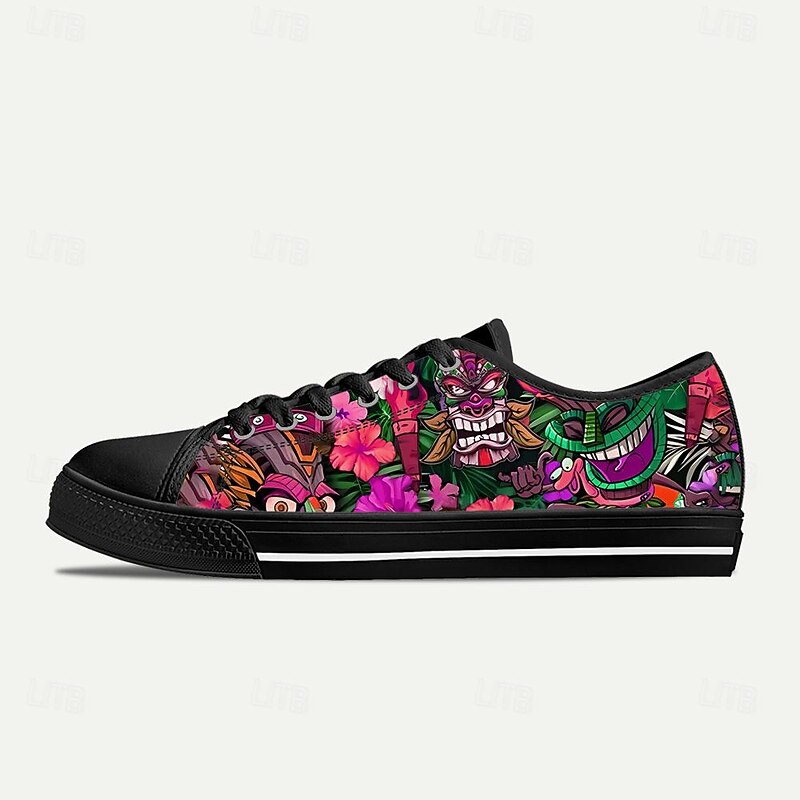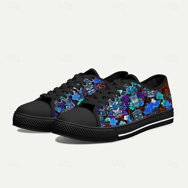 : Featuring a vibrant floral and skull pattern in striking shades of blue, purple, and black, these sneakers make a bold fashion statement. The colorful design is complemented by a robust rubber toe cap for added protection and longevity.
