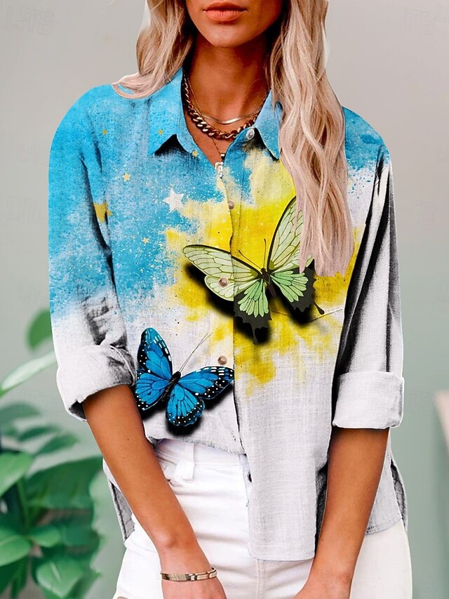 HOT ! Women's Shirt Floral Butterfly Active Daily Stylish Long Sleeve Shirt Collar Regular Tops Daily Holiday Buttons Print White Yellow Blue Purple Green Summer Spring Fall