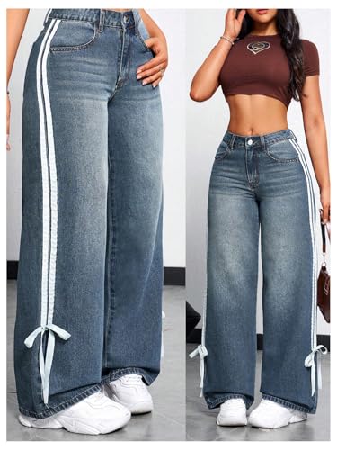 HOT ! MakeMeChic Women's Straight Wide Leg Denim Pants Striped Bow Rise Jeans with Pocket Y2K Streetwear