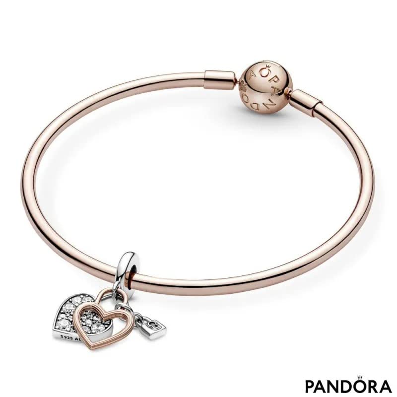 • Sparkling Heart Charm: This meaningful PANDORA charm features the silhouette of a heart in 14k rose gold plating that outlines a sterling silver heart pavé-set with brilliant-cut cubic zirconia