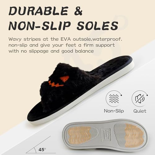 Spooky Halloween Slippers - Soft Fuzz Open Toe Slides for Women, Men & Kids - Goth, Pumpkin & Bat Designs 4