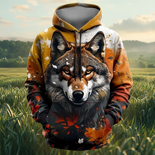 HOT ! Men's Wolf Hoodies Sweatshirt Fashion Cool Long Sleeve Crew Neck Party Holiday Streetwear Brown Drawstring Fall Winter Designer