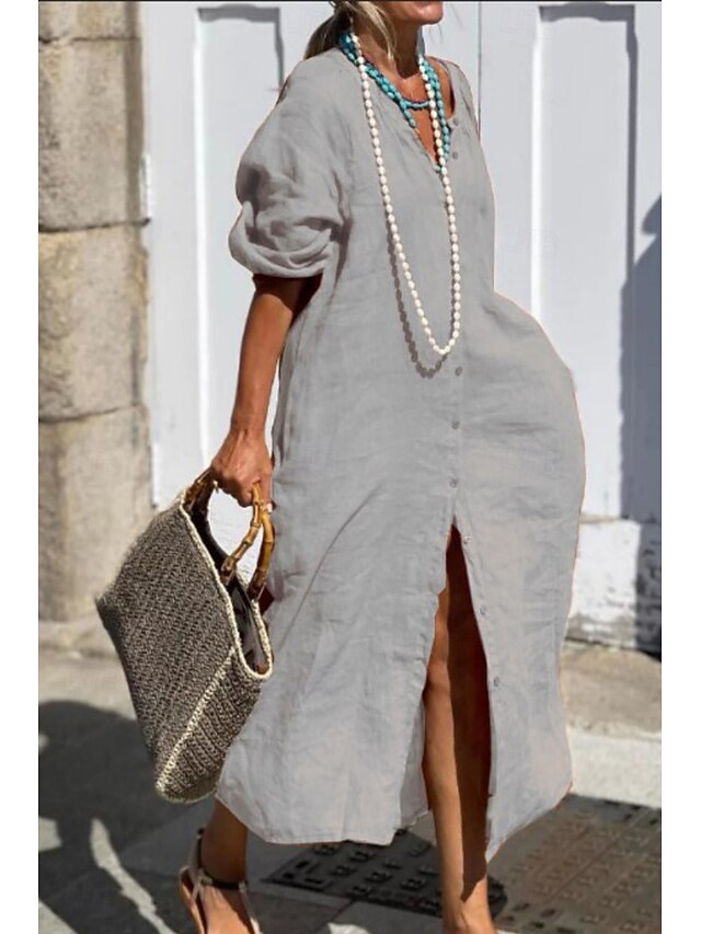 More information about Women's Maxi Dress Cotton Linen Dresses Shirt Dress Casual Dress Basic Casual Vacation Daily Regular Fit Plain Long Sleeve Shirt Collar Gray Summer Spring