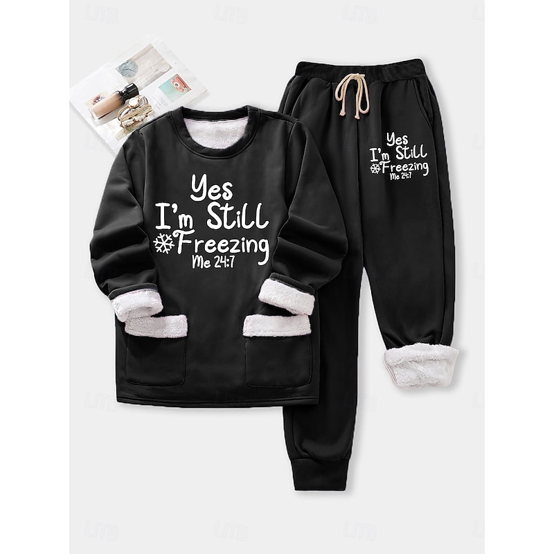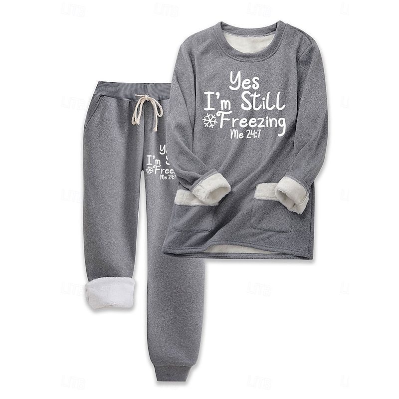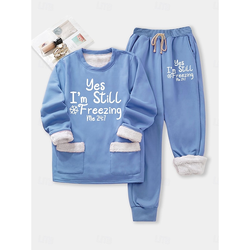 Highlights [Fabric] : Crafted from a blend of polyester and fleece, this women's loungewear set is designed for softness and warmth. The micro-elastic material ensures a comfortable fit, perfect for chilly fall and winter days. [Fit] : Featuring a regular fit, both the top and pants are designed to provide ease and comfort. The top comes with long sleeves and a crew neckline, while the matching pants include an elastic waistband with a drawstring for adjustability. [Design Highlights] : The top is adorned with fluffy white fleece accents on the cuffs and large front pockets for added style and function. It showcases the playful phrase "Yes I'm Still Freezing Me 24:7" on the front, adding a touch of humor. The pants feature cuffed ankles to retain warmth, ensuring you stay cozy. [Occasions] : Ideal for casual daily wear, this set is perfect for lounging at home or enjoying cozy evenings. Its practical yet stylish design makes it a great choice for relaxed settings during colder seasons. [Size Range] : The set is available in a variety of sizes including S, M, L, XL, and 2XL, ensuring a good fit for a range of body types.