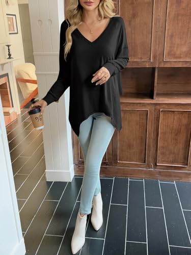 HOT ! Tankaneo Womens Oversized Long Sleeve V Neck Tops Casual Asymmetrical Hem Loose Fit Shirts Trendy Fall Tunic Tops