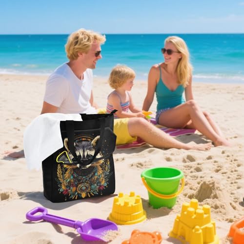 Raccoon Boho Tote Bag for Book Lovers Reusable Bags with Zipper Pocket for School Work Shopping 1