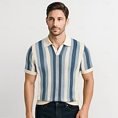 More information about Men's Business Casual V Neck Classic Short Sleeve Vintage Fashion Color Block Vertical Stripes Patchwork Summer Spring Fall Beige