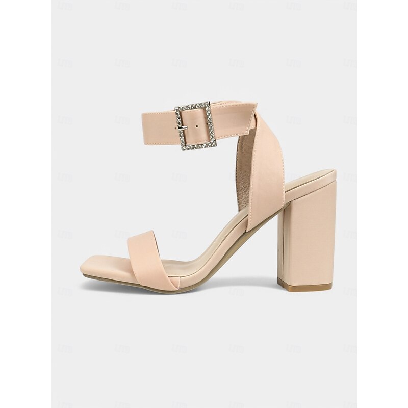 Women's Nude Satin Block Heel Sandals with Rhinestone Buckle Strap, Elegant Design for Cocktail Parties and Special Occasions 1
