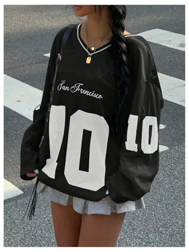 HOT ! Verdusa Women's Jersey Shirt Long Sleeve Y2K Oversized V Neck Mesh Sport Graphic Tee Tops