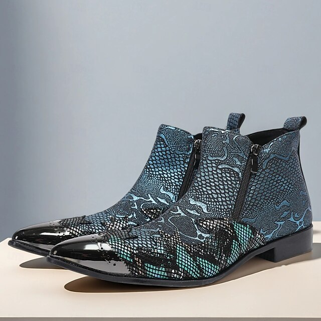 Men's Blue Snakeskin Pointed Toe Ankle Boots – Rock Star Cowhide Zip-Up Boots for Concerts, Festivals and Themed Occasions 7