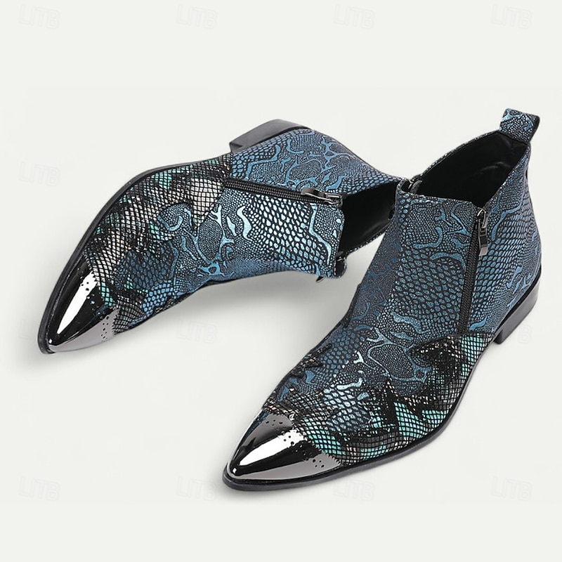 HOT ! Men's Blue Snakeskin Pointed Toe Ankle Boots – Rock Star Cowhide Zip-Up Boots for Concerts, Festivals and Themed Occasions